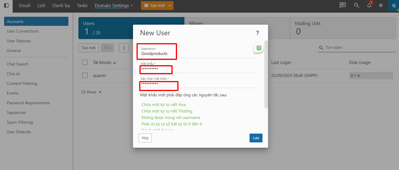 Nhấp vào tạo mới và hiện form điền thông tin. nhập đủ thông tin vào xong ấn Lưu