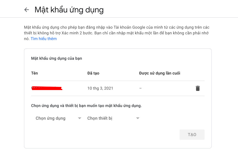 Giao diện không thấy mục tạo mật khẩu ứng dụng ( Do chưa bật xác thực 2 bước)